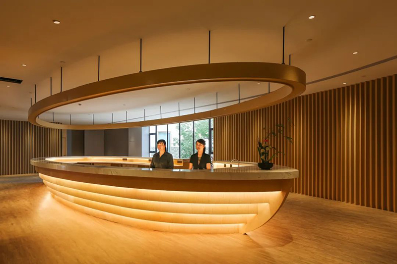书香世家·树山温泉度假酒店则充分体现了书香酒店对环境营造之美的极致追求。酒店坐落于苏州高新区树山生态园内,四周山野绿林环绕,鸟语花香,负氧离子浓度极高,可谓是奢华养生的秘境天堂。基于此,酒店结合生态园特色,以“四美”为核心,在酒店大堂的设计上独具文化魅力。摇橹木船状的服务台、链接大堂两端的原木拱桥,水面的几株绿植伴随流水潺潺、清香徐徐,将宾客带入了一个如诗如画的江南水岸。