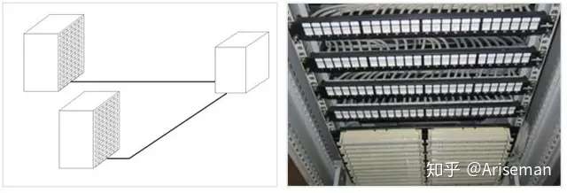 18、配线架:电缆或光缆进行端接和连接的装置。在配线架上可进行互连或交接操作。